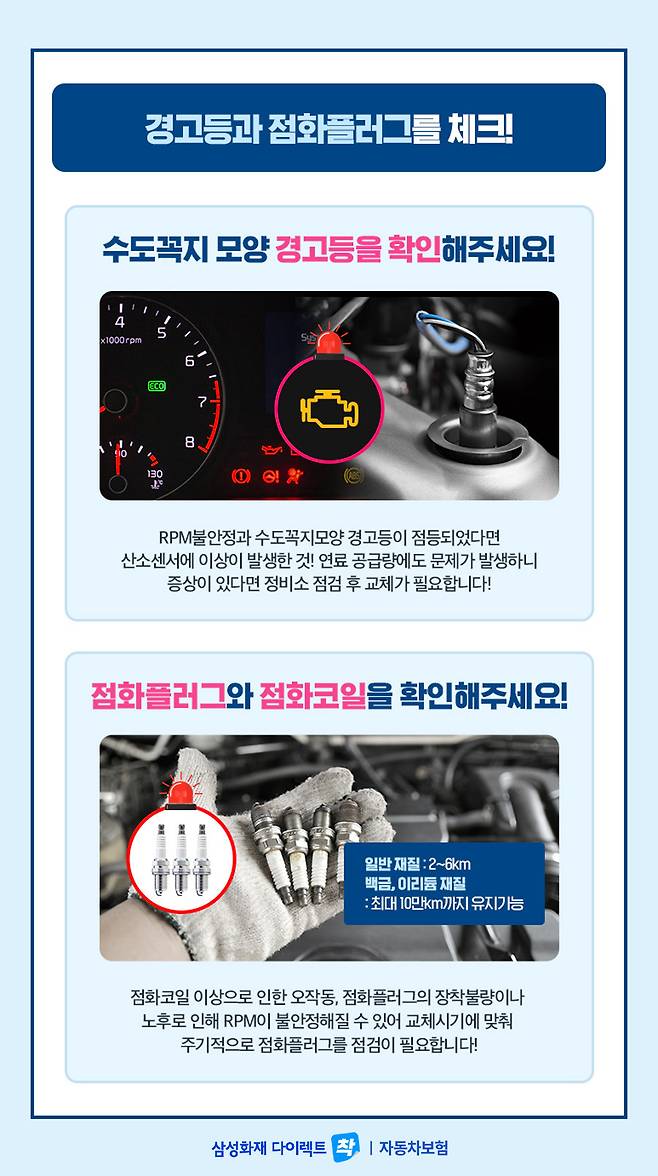 점화플러그는 고전압으로 필요로 하는데 점화코일 이상으로 인한 오작동, 점화플러그의 장착불량이나 노후로 인해 RPM이 불안정해질 수 있어 교체시기에 맞춰 주기적으로 점화플러그를 점검 해야합니다.