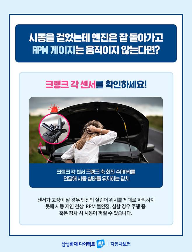 시동은 걸었는데 엔진은 잘 돌아가고 RPM게이지는 움직이지 않는다면? 크랭크 각 센서 고장을 의심해볼 수 있습니다.