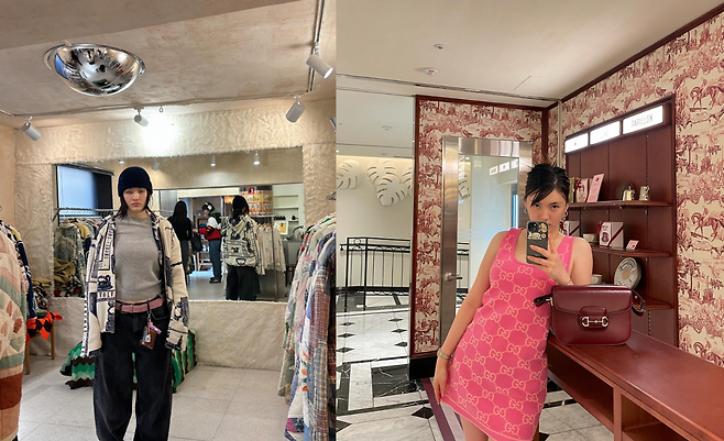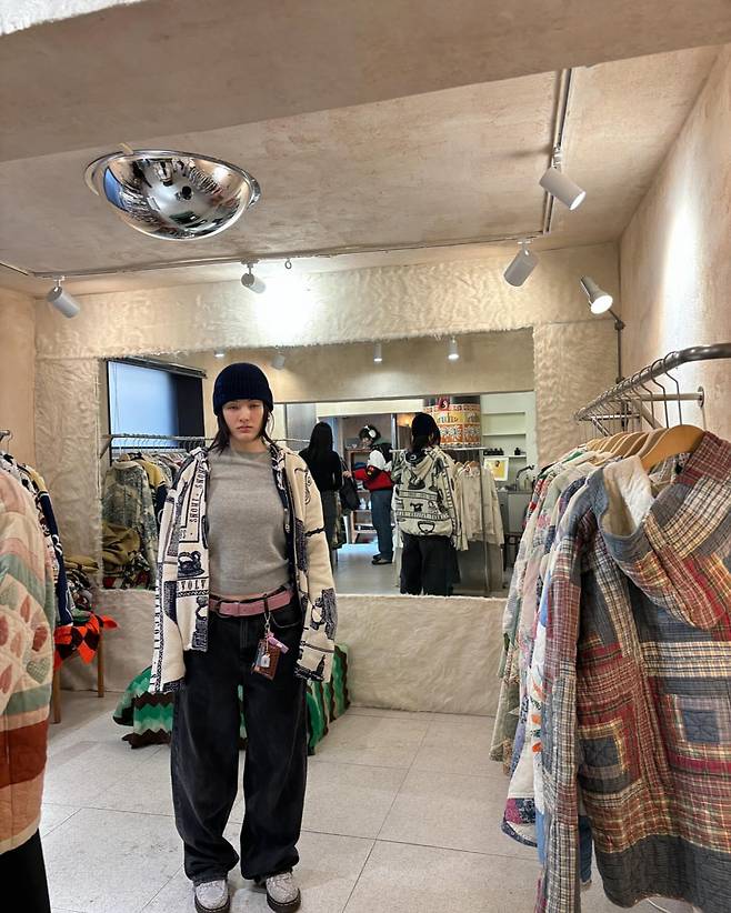 김용지가 개성 넘치는 빈티지 레이어드 룩을 선보이고 있다. 그래픽 패턴이 돋보이는 화이트 재킷과 심플한 그레이 니트, 블랙 와이드 팬츠의 조합으로 스트리트 감성을 살렸다. 특히 블랙 비니와 핑크 벨트로 포인트를 주어 전체적인 스타일에 생동감을 더했다. 의류 매장 내부에서 촬영된 이 룩은 트렌디한 빈티지 무드와 실용적인 레이어드 스타일링의 조화를 완벽하게 보여주고 있다.