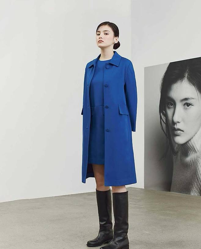 배우 김용지가 선명한 로얄 블루 색상의 코트 룩으로 시선을 사로잡고 있다. 미니멀한 디자인의 블루 원피스 위에 같은 색상의 롱코트를 매치해 통일감 있는 모노톤 스타일링을 연출하고 있다. 특히 블랙 롱부츠와의 대비를 통해 세련된 도시적 감각을 드러내며, 단정하게 올린 헤어스타일은 전체적인 룩의 깔끔함을 더하고 있다. 심플하면서도 강렬한 컬러 선택으로 패션 감각을 유감없이 발휘하고 있다.