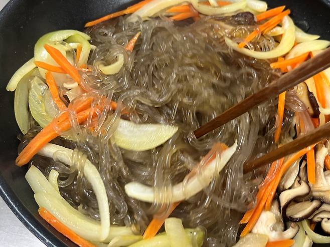 간을 맞춘 당면에 볶아둔 야채를 넣어 함께 버무려 주세요. 재료가 골고루 섞이도록 젓가락으로 가볍게 섞어주면, 윤기 나고 색감이 고운 잡채가 완성됩니다.