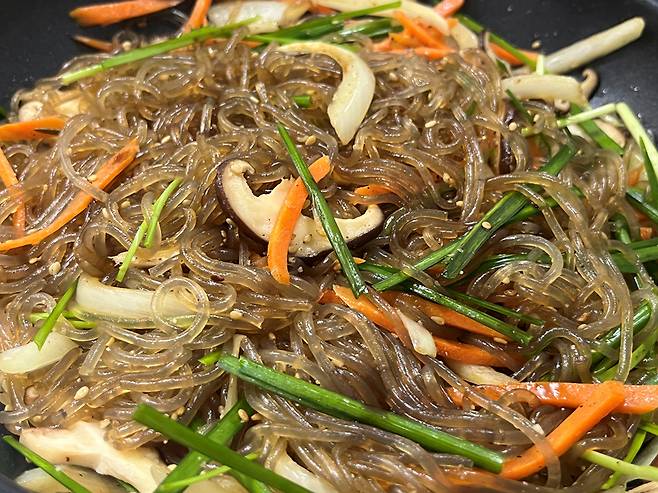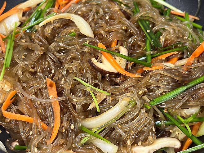 당면을 충분히 불린 후 기름에 볶아 만들면 당면 표면이 코팅되어 시간이 지나도 퍼지지 않고 쫄깃한 식감이 유지됩니다. 또한 양념이 고르게 배면서 윤기 나고 감칠맛 있는 잡채가 완성됩니다.