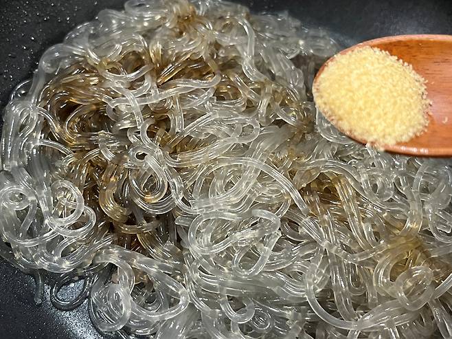 삶은 당면은 체에 밭쳐 물기를 탈탈 털어내고 팬에 넣어서 볶습니다. 당면은 전분으로 만들어져 있어 수분을 흡수하면 쉽게 퍼집니다. 볶을 때 식용유 등을 넣어 당면 표면을 코팅해 주면, 수분이 직접 닿지 않아 불거나 퍼지는 것을 방지합니다.