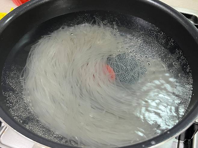 당면을 끓는 물에 넣어서 정확하게 6~7분 삶아 줍니다. 당면 양에 따라 조리 시간은 달라질 수 있으나 6~7분 범위 내에서 익혀 주세요.