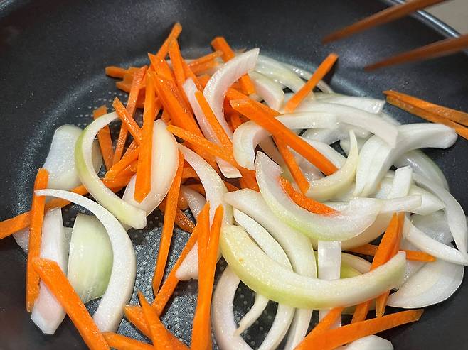 양파, 당근, 버섯 등을 따로 볶아서 익혀줍니다. 잡채는 당면뿐 아니라 야채, 고기 등 여러 가지 재료가 들어가야 더욱 맛이 살아납니다.