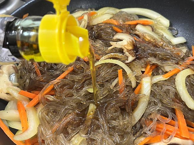 당면을 충분히 불린 후 기름에 볶아 만들면 당면 표면이 코팅되어 시간이 지나도 퍼지지 않고 쫄깃한 식감이 유지됩니다. 또한 양념이 고르게 배면서 윤기 나고 감칠맛 있는 잡채가 완성됩니다.