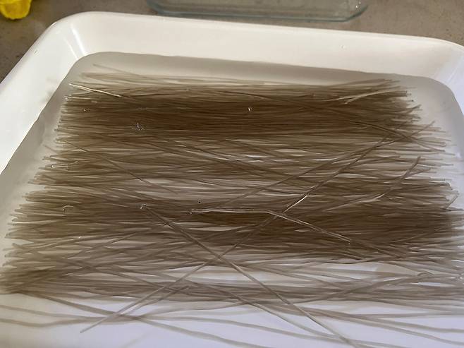 잡채는 만들기 전 당면을 반드시 불려서 준비하세요. 최소 1시간 이상 찬물에 푹 담가 불립니다. 찬물에 당면을 불리면 천천히 수분이 스며들어 당면이 퍼지지 않고 쫄깃한 식감이 유지됩니다.