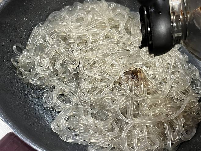 삶은 당면은 체에 밭쳐 물기를 탈탈 털어내고 팬에 넣어서 볶습니다. 당면은 전분으로 만들어져 있어 수분을 흡수하면 쉽게 퍼집니다. 볶을 때 식용유 등을 넣어 당면 표면을 코팅해 주면, 수분이 직접 닿지 않아 불거나 퍼지는 것을 방지합니다.