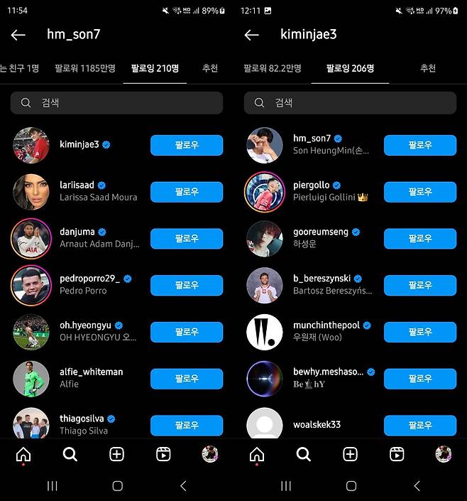 손흥민과 김민재가 서로의 SNS를 다시 '팔로우'했다.