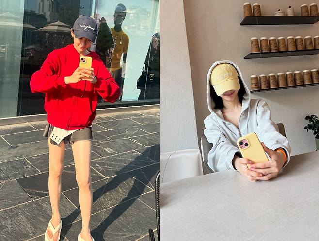 후드 집업에 반바지, 캡모자를 매치한 룩은 활동적이면서도 편안한 일상 패션을 보여준다.