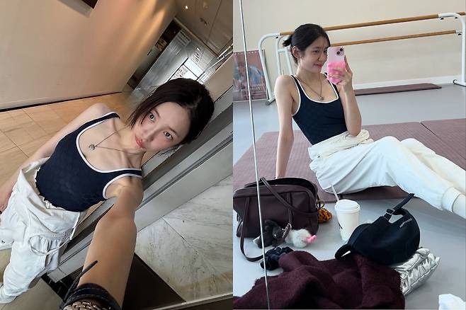 또 다른 사진에서는 심플한 민소매 레오타드에 조거 팬츠를 매치해 발레 운동복도 스타일리시하게 완성했다.