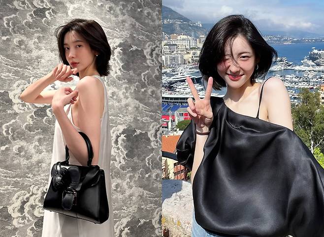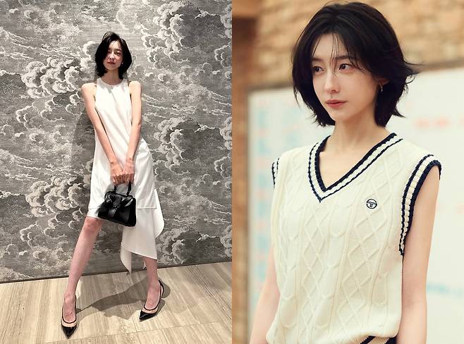 흰색 언밸런스 컷 드레스에 블랙 토트백, 뾰족한 하이힐을 매치한 룩과 새틴 재질의 어깨가 드러난 의상은 모던하면서도 고급스러운 무드를 자아내고 있다.