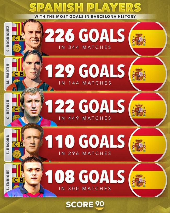 스페인 국적 선수 중 가장 많은 득점을 기록한 건 226골의 세사르 로드리게스였다. 마리아노 마르틴(129골), 카를레스 렉사흐(122골), 에스타니슬라오 바소라(110골), 엔리케(108골)가 뒤를 이었다. 엔리케는 5위였다.