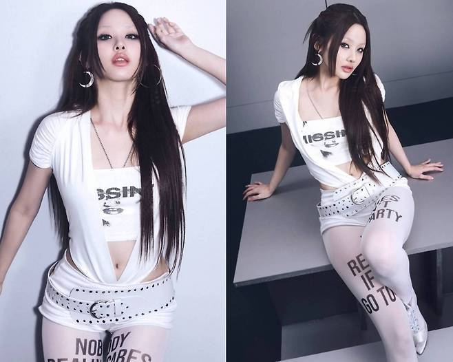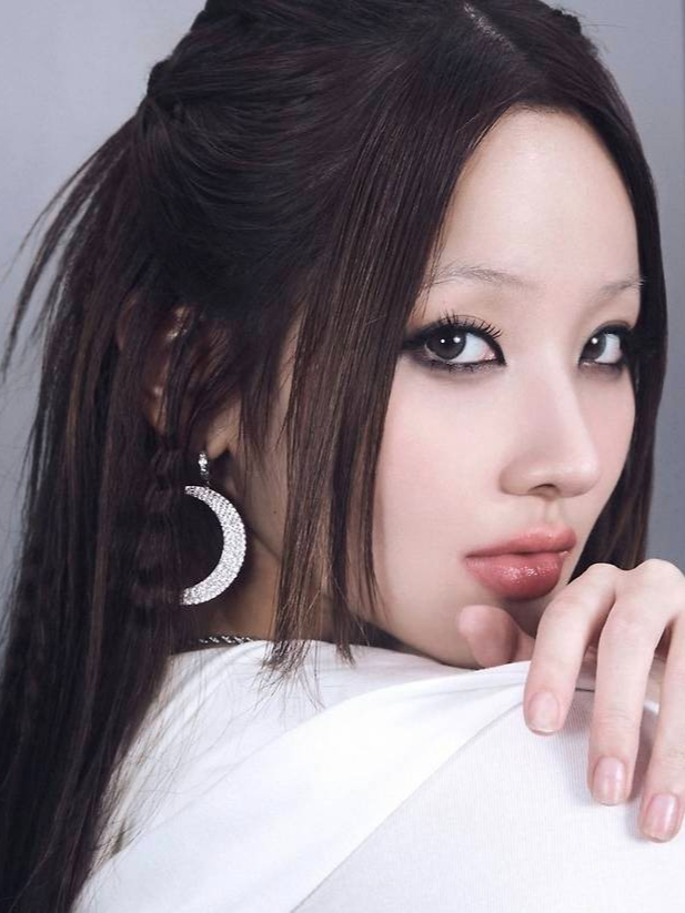 여기에 하얗고 흐리게 연출한 눈썹, 글로시 립, 스트레이트 헤어로 완성된 메이크업은 2000년대 클럽 키드 감성을 재현하며 트렌디함과 비주얼 임팩트를 모두 챙겼습니다.