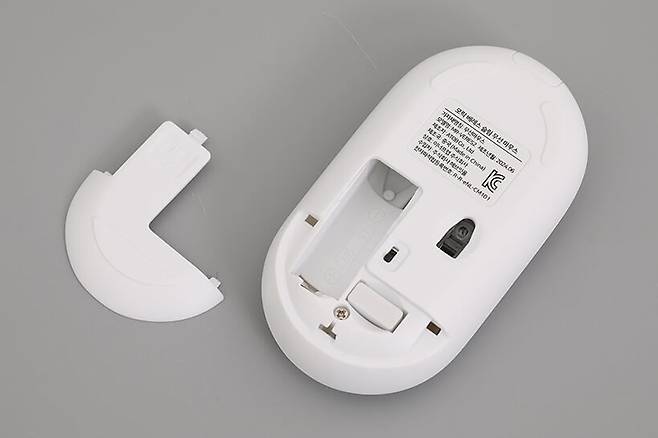 바닥 면에 있는 배터리 덮개를 아래쪽으로 밀어서 분리하면 배터리를 넣는 공간이 나타나는데, 배터리는 AA 타입 하나를 사용한다. 배터리를 넣는 공간 바로 옆에는 무선 리시버가 삽입되어 있다. 이처럼 마우스 본체 안에 무선 리시버를 수납할 수 있는 공간이 있는 경우 휴대 시 따로 챙기지 않아도 되기 때문에 리시버를 분실할 위험도 줄어든다.