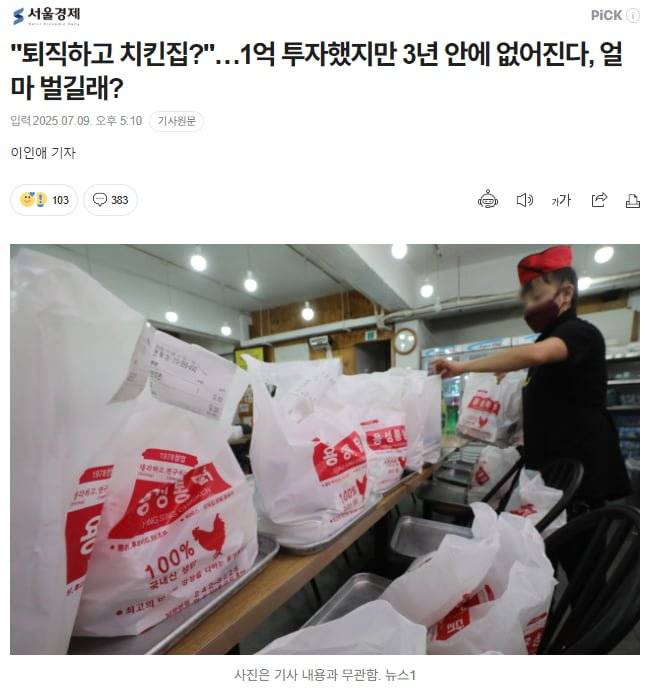 8일 한국농촌경제연구원(KREI)의 '2024 외식업체 경영실태 조사 통계보고서'에 따르면 치킨집의 평균 영업이익은 1711만 원으로 외식업 평균(2246만5000원)을 크게 밑돌았다. 치킨집 10곳 중 7곳(72.2%)은 영업이익이 2000만 원에도 미치지 못했다.