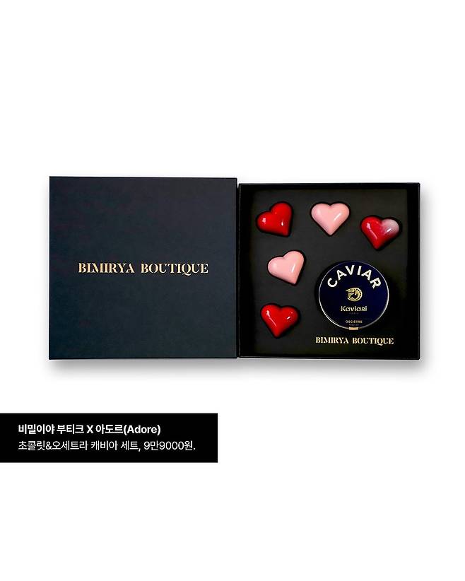 하이엔드 초콜릿 숍 아도르가 세계 3대 진미인 트러플과 캐비아를 유통하는 비밀이야부티크와 만났습니다. 헤이즐넛&밀크, 라즈베리&레몬 화이트, 트러플&다크초콜릿의 총 세가지 맛 초콜릿과 20g의 오세트라 캐비아가 함께 패키징 된 것인데요.