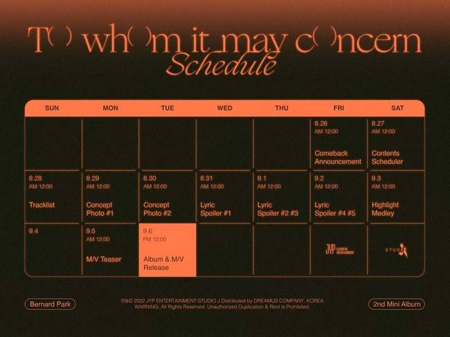 JYP엔터테인먼트는 8월 27일 공식 SNS 채널에 버나드 박 미니 2집 'To whom it may concern'의 티징 플랜을 발표했다.