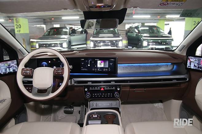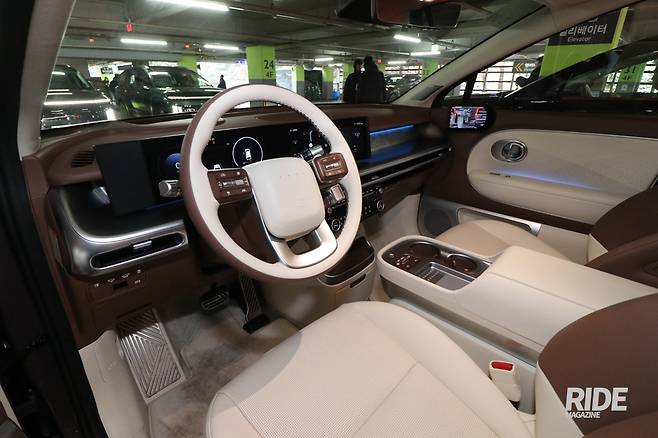 대중 브랜드라고는 해도 플래그십 모델인 만큼 실내는 고급스러움이 느껴지도록 구성했다. 시승차는 베이지와 브라운 투톤 컬러로 실내를 덮었는데 바닥 매트까지 베이지색이어서 오염이 잘 드러나는 방식이라 청결 유지 난이도가 상당하겠다, 크래시 패드 쪽으로는 마치 자연석 같은 무늬로 덮어놓고 그 위로 앰비언트 라이트를 더했는데, 이 또한 독특하면서도 고급스러움을 높여주는 요소다.