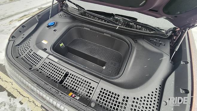 이렇게 말할 수 있는 건 여태 소개된 아이오닉 시리즈 가운데 가장 큰 사이즈이기 때문이다. 전장 5,060mm, 전폭 1,980mm, 전고 1,790mm에 휠베이스 3,130mm로, 내연기관 모델과 비교한다면 팰리세이드와 전장, 전폭이 동일하고, 전고만 15mm 낮으며 휠베이스는 아이오닉 9가 160mm 더 길다. 기아 카니발과 비교해도 전장은 95mm, 전폭은 15mm 작지만 전고는 15mm 더 높고, 휠베이스도 40mm 더 길다. 즉 실내 공간만 놓고 보면 팰리세이드나 카니발보다 더 넓은 공간을 쓸수 있다는 것. E-GMP 기반으로 만들어진 점은 아이오닉 5든 아이오닉 9든 동일하지만, 차원이 다른 공간을 확보할 수 있게 된 것이다. 이를 통해 3열 시트를 접어 ㅍ내린 상태에서의 적재 용량은 1,323L에 달하니 상용으로 쓰지 않는 이상 어지간해선 적재 공간이 부족하다고 느낄 일은 없겠다. 자주 사용하지 않는 차량용품의 경우엔 보닛 아래에 숨어있는 88L의 추가 수납 공간을 이용해 트렁크를 깔끔하게 정리할 수 있는데, 의아했던 건 보닛을 열기 위해선 커버를 분리한 후 레버를 젖혀야 한다는 것. 일반적으로 보닛 레버에는 커버를 잘 덮지 않았는데 굳이 이렇게 한 이유가 궁금하다.