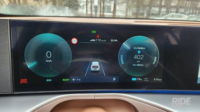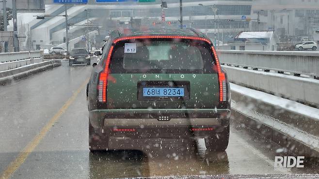 아이오닉 9가 인증받은 주행거리는 최대 532km(항속형 2WD, 19인치 휠)로, 서울에서 부산까지 쉬지 않고 달려도 아슬아슬하게 도착하는 것이 아닌, 여유있는 주행거리가 남는 수준이다. 현대차에서 1월 21일에 서울에서 부산까지 직접 주행해봤을 때도 433km를 달리고도 20%의 배터리가 남아 80km 이상 더 달릴 수 있었다고 한다. 직접 시승했을 때도 0℃ 전후의 낮은 기온에서 88% 배터리 잔량으로 442km를 달릴 수 있다고 표시됐는데, 100%로 환산하면 502km 정도로 공인 연비와 엇비슷한 수준이다. 기착지까지 47km의 구간을 달렸는데, 배터리 잔량 79%에 잔여 주행거리 402km로, 앞선 기록과 크게 다르지 않은 수준이었다. 이 정도면 기온이 더 올라가는 봄이나 여름, 가을에는 600km 이상의 주행거리도 가볍게 넘길 것으로 기대되고, 실제 WLTP 기준 620km(항속형 2WD, 19인치 휠)의 주행거리를 확보했다고 한다.