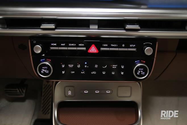 실내는 최신 현대차에 적용되는 요소들이 두루 들어갔다. 특히 아이오닉 5에도 탑재됐던 유니버설 아일랜드 콘솔은 업그레이드가 이뤄져 이동거리가 190mm 더 늘어났고, 내부 공간은 총상단 커버의 5.6L에 하단 12.6L가 합쳐져 18L가 넘어 부피가 있는 물건도 수납하기 좋겠다. 그리고 처음으로 100W급 고출력 USB 충전포트가 탑재됐다. 4,000mAh 배터리를 충전할 때 일반 충전으로는 76분 걸리지만, 100W급 고속 충전으로는 17분밖에 걸리지 않는다는 것. 따라서 높은 배터리 용량을 갖춘 스마트폰이나 노트북 등을 충전하기에 적합한데, 이를 위해선 기기에서 100W급 전력을 받아들일 수 있는 사양이 갖춰져야 하는 건 물론이고 100W급 전력을 전달할 수 있는 USB 케이블이 있어야 하는데 이는 현대차 순정 액세서리로 판매한다고 하니 구입해 쓰는 것도 좋을 듯.