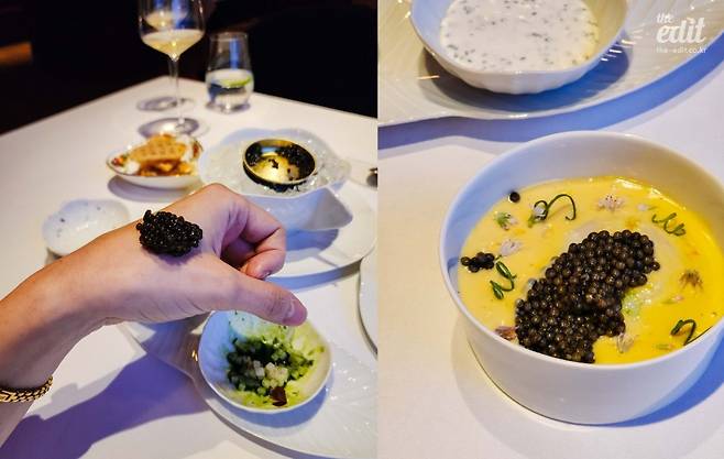 그리고 라망시크레의 모토 Evolve를 상징하는 계란과 캐비아 요리야. 이 요리의 다양한 버전을 먹어 보았는데 이번에는 모든 요소를 분리해서 더 개인의 입맛에 맞게 조정하는 형태로 서빙이 되었지. 그래서 이번에는 온전히 캐비어만 듬뿍 떠서 손등에 올려 먹는 호사도 누려 보고, 샴페인도 한 모금 마시고, 또 절반은 고소한 계란이 들어간 훈연 가자미 사바용 소스에 허브 오일, 다양한 가니쉬와 듬뿍 넣어 슥슥 비벼도 먹고, 바삭한 사워도우 와플에 올려 먹기도 하고… 하나의 코스이지만, 네다섯 가지 이상의 조합으로 다채로운 즐거움을 느끼며 오랜 시간 코스를 즐겼어.