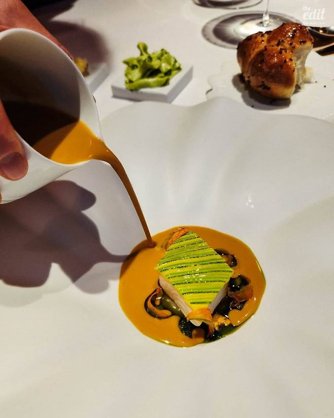 그리고 두 가지 빵과 함께 두 가지 버터가 나오는데, 버터 모양 좀 봐! 정말 이 공간, 셰프의 스타일과 너무 잘 어울리지? 초록 버터는 아까 소개한 옥상의 비밀 정원에서 재배한 허브를 잔뜩 다져 넣은 허브 버터로, 듬뿍 발라 먹어도 왠지 살찌지 않을 것 같은 느낌이야. 참고로 나는 버터 애호가라 한 번에 저 버터를 절반씩 푹 떠서 빵 위에 ‘올려’ 먹어. 버터를 나이프로 얇게 ‘발라’ 먹는 것과는 차원이 다른 맛의 풍부함을 느낄 수 있으니, 생각보다 더 듬뿍 버터를 빵 위에 한 번 얹어 먹어 보길!