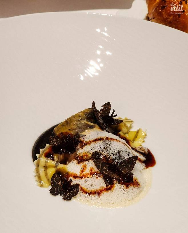 드디어 메인 코스! 메인은 껍질 아래에 트러플을 잔뜩 넣은 향기로운 닭과 잣 소스야. 일단 전체 닭의 모습을 보여주고, 주방으로 다시 가지고 들어가서 플레이팅한 뒤 서빙돼. 저 디쉬를 받고 자세히 보니 검은색 나비가 가득하더라. 블랙 트러플을 얇게 슬라이스 한 뒤 펀치로 찍어 나비 모양을 낸 거야. 그리고 남는 자투리 트러플은 소스에 넣어 활용했어. 아무튼, 정말 화려하다니까.