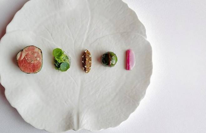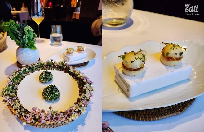 다음 코스는 ‘비밀의 정원에서 온 작은 한 입 거리들’이야. 바구니에 신선한 채소와 함께, 앙증맞은 허브 부케를 비롯해 작은 요리들이 준비돼. 여기서 잠깐! 비밀의 정원은 어디일까? 바로 레스토랑의 비상계단으로 나가 올라가면 깜짝 놀랄 공간이 하나 있는데, 여기서 다양한 허브가 재배돼. 캡슐커피 찌꺼기로 만든 퇴비를 사용하고, 레스토랑 바로 위의 빈 공간에서 직접 허브를 재배해 요리에 사용하는 거지. 일반 고객들에게 공개되는 공간은 아니지만, 종종 직원들의 인스타를 통해 정원을 가꾸는 모습, 휴게시간에 정원에서 쉬는 모습을 엿볼 수 있어.