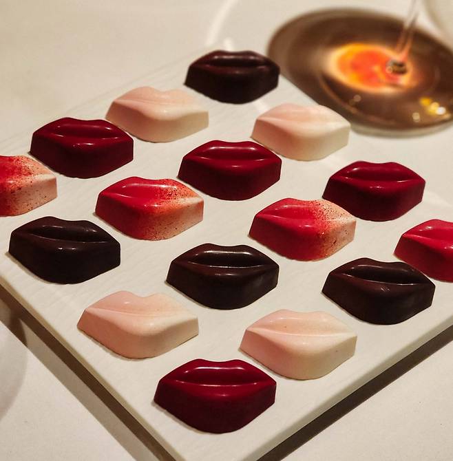 마지막 코스, ‘굿바이 키스’. 여기 얽힌 재미있는 일화가 있는데, 예전에 다른 미쉐린 스타 셰프님과 함께 이곳에서 식사한 적이 있거든. 그분이 이 초콜릿을 받자마자 “이 입술 손종원 셰프님 입술을 본따 만든 것인가요?”라고 묻더라고. 하하하. 그렇게는 생각해 본 적이 한 번도 없었는데, 갑자기 그 순간 막 집어먹기가 조금 머뭇거려지던 기억. 다행히도(?) 누구의 실제 입술은 아니라는 점! 그리고 네 가지 초콜릿은, 그중 한두 개를 선택할 수도 있지만, 당당히 네 개 다 맛보고 싶다고 요청해도 되니까 마지막까지 기분 좋게, 야무지게, 네 개 다 먹으며 마무리하기를 제안할게.