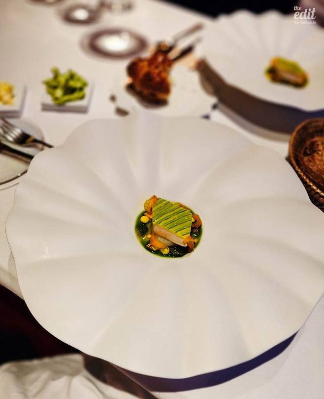 그리고 다음은 초당옥수수 차우더. 입 안에서 은은한 단맛과 여리게 흩어지는 질감이 훌륭했던 요리야. 지금까지의 요리를 눈으로 보기만 해도 알겠지만, 라망시크레는 보석을 세공하듯 굉장히 정교하고 세밀하며 장식적인 플레이팅이 인상적이지. 파인다이닝이 맛있어야 함은 물론인데, 여기에 시각적인 아름다움까지 더해지니 정말 먹는 예술이라는 말이 아깝지 않아.