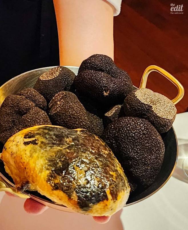 솁은 이곳을 찾은 사람들에게 일상에서 잠시 벗어나 놀이동산에 온 듯 ‘즐거움’을 느낄 수 있는 경험을 선사하고 싶었다고 하더라고. 그래서 프렌치 기반의 컨템퍼러리 요리를 제공하면서도 코스 곳곳에 위트를 담아냈어. 트러플 요리가 나올 때 강아지가 땅에서 트러플을 캐내는 영상을 바구니에 담아 함께 보여준다거나, 명동 근처에서 맛볼 수 있는 길거리 음식을 작은 한입 요리로 재해석해 낸다거나 하는 것들.