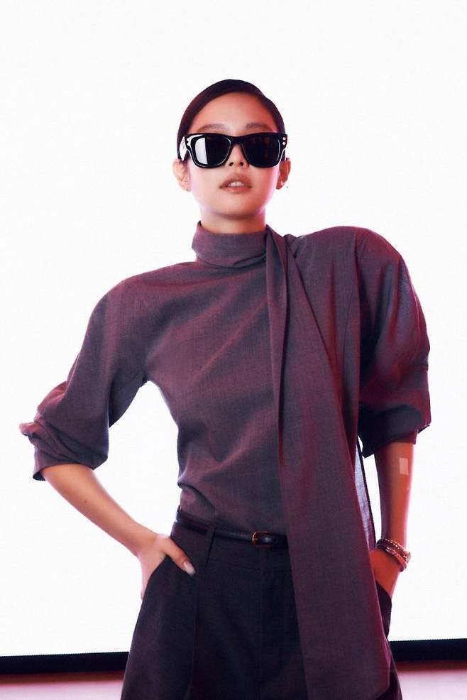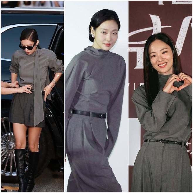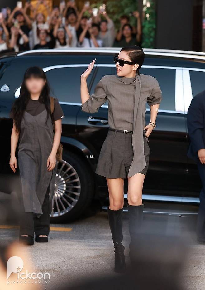 제니는 이 블라우스를 가장 단순한 방식으로 풀었다. 컬러를 누르고, 하의 역시 과하지 않게 맞췄다.