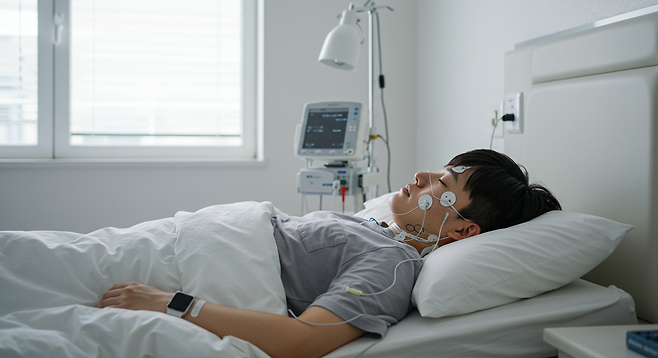 - 검사 진행: 하룻밤 동안 뇌파, 심전도, 근전도, 호흡 흐름, 코골이, 산소포화도, 다리 움직임 등을 종합적으로 기록