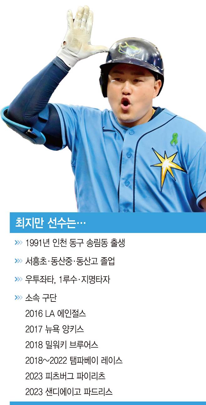 2009년 시애틀 매리너스와 계약을 맺고, 2016년 메이저리그 구장을 밟기까지 꼬박 7년. 인천 동산고를 졸업하자마자 미국으로 건너간 최지만은 오랜 마이너리그 생활 끝에 메이저리그에서 실력을 펼쳐보이며 525경기에 출장해 367안타, 67홈런을 기록했다. LA에서 뉴욕으로, 밀워키를 거쳐 탬파베이로, 다시 피츠버그와 샌디에이고로 옮겨가며 쌓아올린 숫자는 후배들에게 이정표가 됐다.