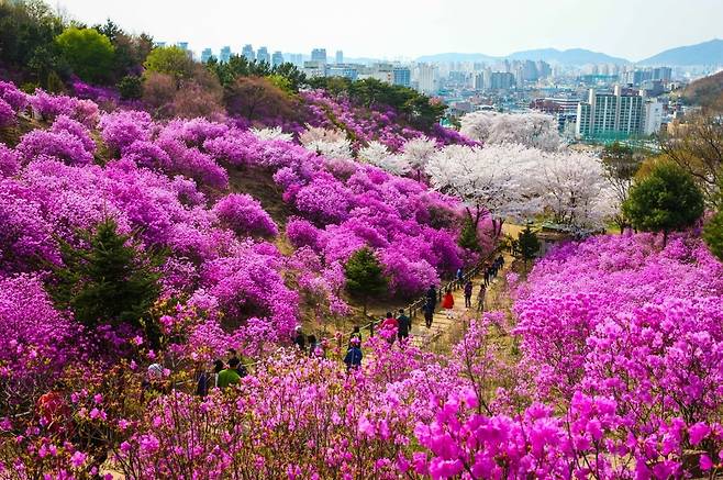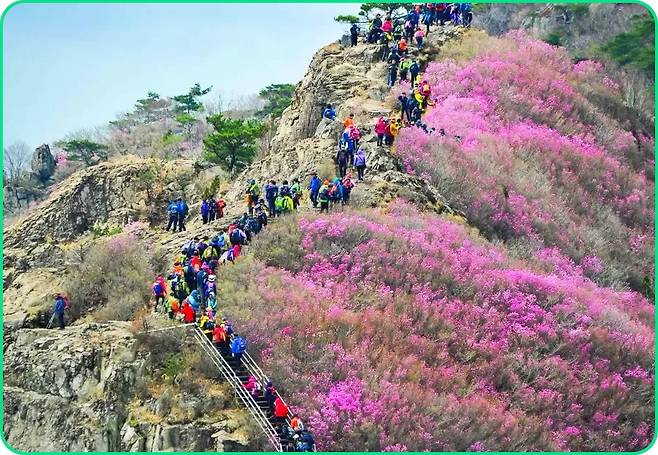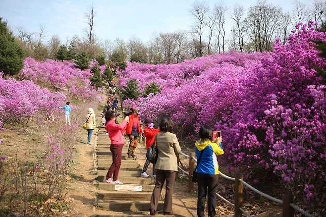 특히 이곳이 주목받는 이유는 약 3만 그루에 달하는 진달래 군락이다. 봄이 절정에 이르면 산을 따라 빼곡하게 피어난 진달래가 장관을 이루며, 어디를 바라봐도 분홍빛 물결이 이어지는 풍경을 만들어낸다. 완만한 경사의 산책로를 따라 천천히 걸으며 꽃을 감상할 수 있어 남녀노소 누구나 부담 없이 즐기기 좋은 장소다.