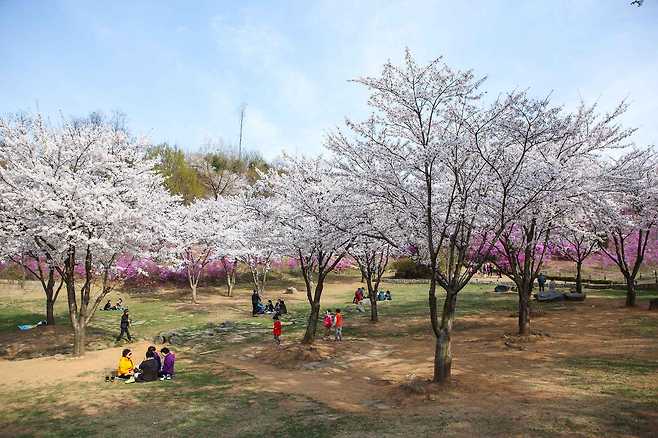 특히 이곳이 주목받는 이유는 약 3만 그루에 달하는 진달래 군락이다. 봄이 절정에 이르면 산을 따라 빼곡하게 피어난 진달래가 장관을 이루며, 어디를 바라봐도 분홍빛 물결이 이어지는 풍경을 만들어낸다. 완만한 경사의 산책로를 따라 천천히 걸으며 꽃을 감상할 수 있어 남녀노소 누구나 부담 없이 즐기기 좋은 장소다.