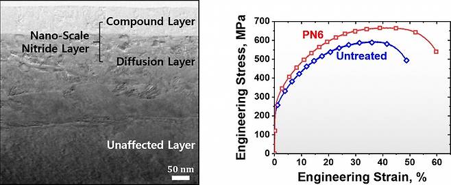 김형섭 교수 연구팀은 이를 산업계에서 활발하게 사용하고 있는 ‘STS304 강종’과 최근 연구가 활발한 ‘고엔트로피 합금’에 적용한 결과 금속 표면에 약 300㎚ 두께의 나노 질화물층이 형성된 점을 확인했다고 밝혔다. 기본적인 구조나 결정 같은 재료의 특성은 변하지 않은 가운데 인장강도가 향상되고 균일 연신율이 7.9% 증가하는 등 강도와 연성이 모두 높아진 점을 확인했다.