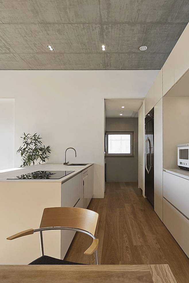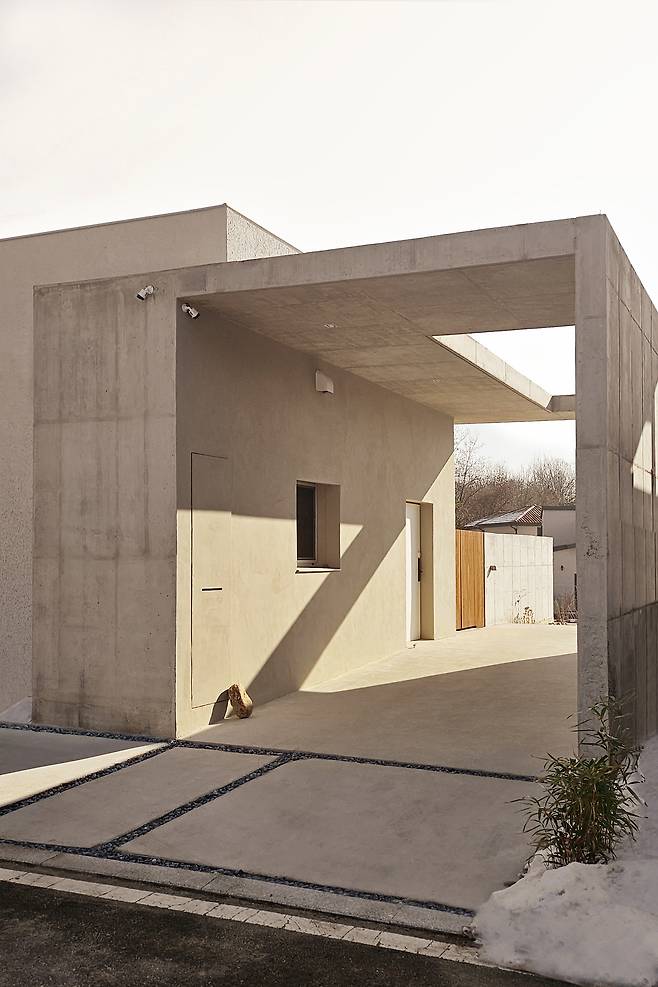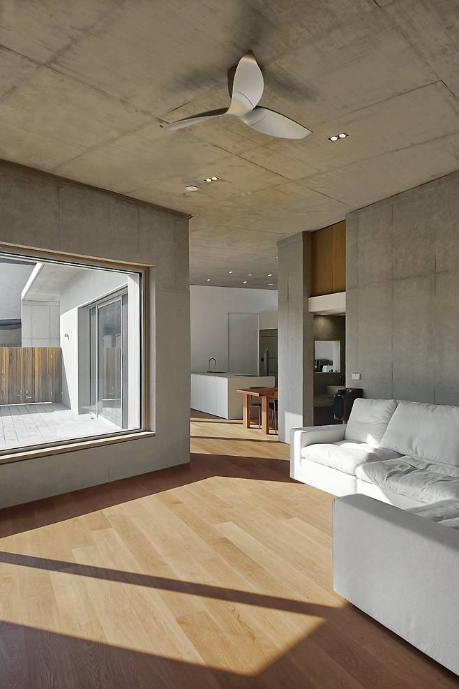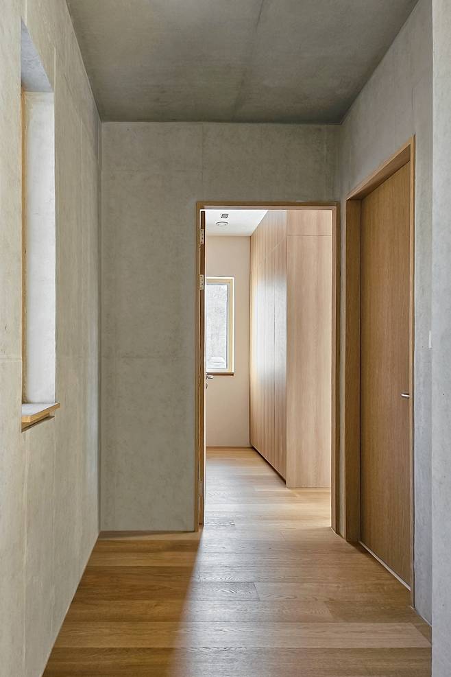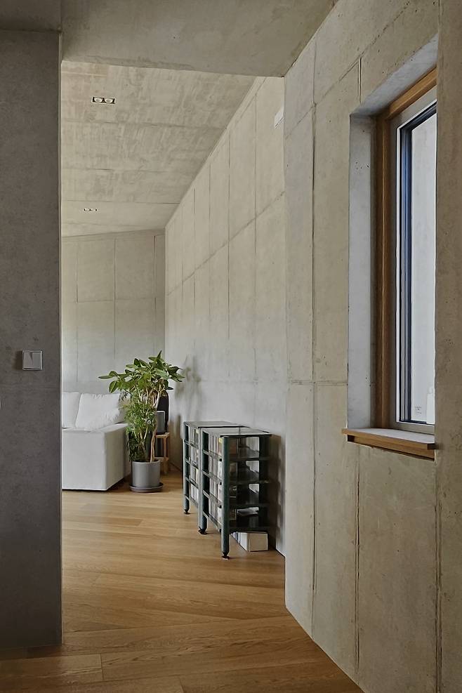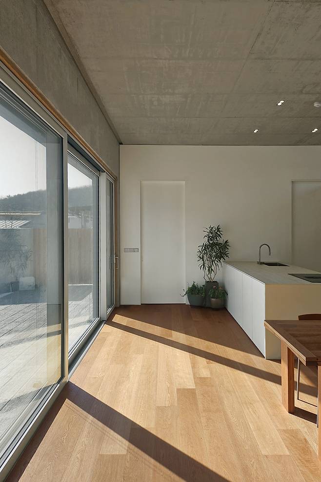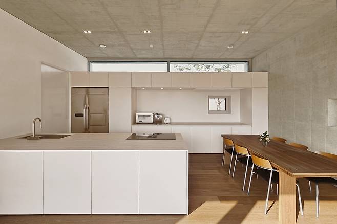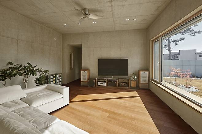 실내 마감의 가장 큰 특징은 노출 콘크리트 마감이다. 부정적인 의견도 있었지만 단점보다는 공사비 절감, 축열 성능, 화학적 마감재로 인한 냄새 없음 등 장점이 더 많아 과감히 선택했다는 게 건축가의 설명이다. 다만, 바닥재는 보다 따뜻한 느낌이 들 수 있도록 원목마루로 선정했다. 외부 데크재도 고목의 느낌이 나는 밀보드를 적용해 실내원목마루와 연장선으로 보이도록 했다.