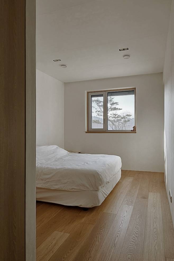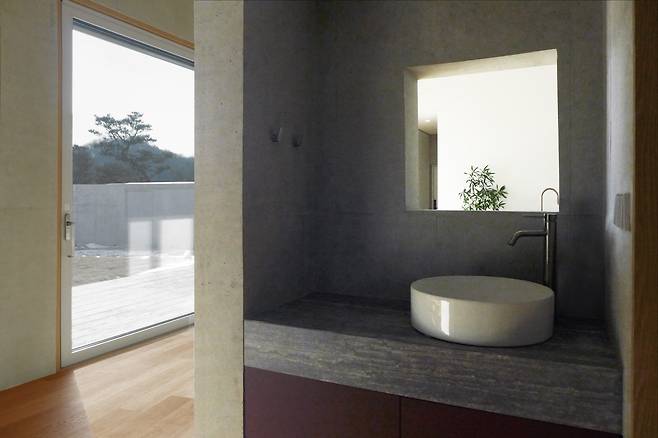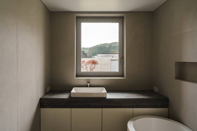 특히 주방의 아일랜드 조리대는 개방감 있는 실내에 맞게 넉넉한 크기로 계획했다. 현관 쪽에 서서 내부를 바라보면 묘한 호기심이 생긴다. 거실 공간은 오른쪽으로 꺾여 있어 잘 보이지 않기 때문인데, 거실 끝의 비교적 작고 아담한 출입구가 호기심을 발동시킨다. 이 숨겨진 공간에는 욕실과 안방이 위치한다. 욕실은 밝은 아이보리 톤 타일로 마감해 깔끔하게 조성했다. 마당을 향해 난 창문은 여느 욕실과 다르게 큰 편으로 이는 노천탕에 온 느낌을 받고 싶다는 건축주의 바람이 담긴 설계다. 창을 통해 들어오는 자연광이 화이트 톤 욕조에서 매우 밝게 빛나고 있어 인상적이었다.