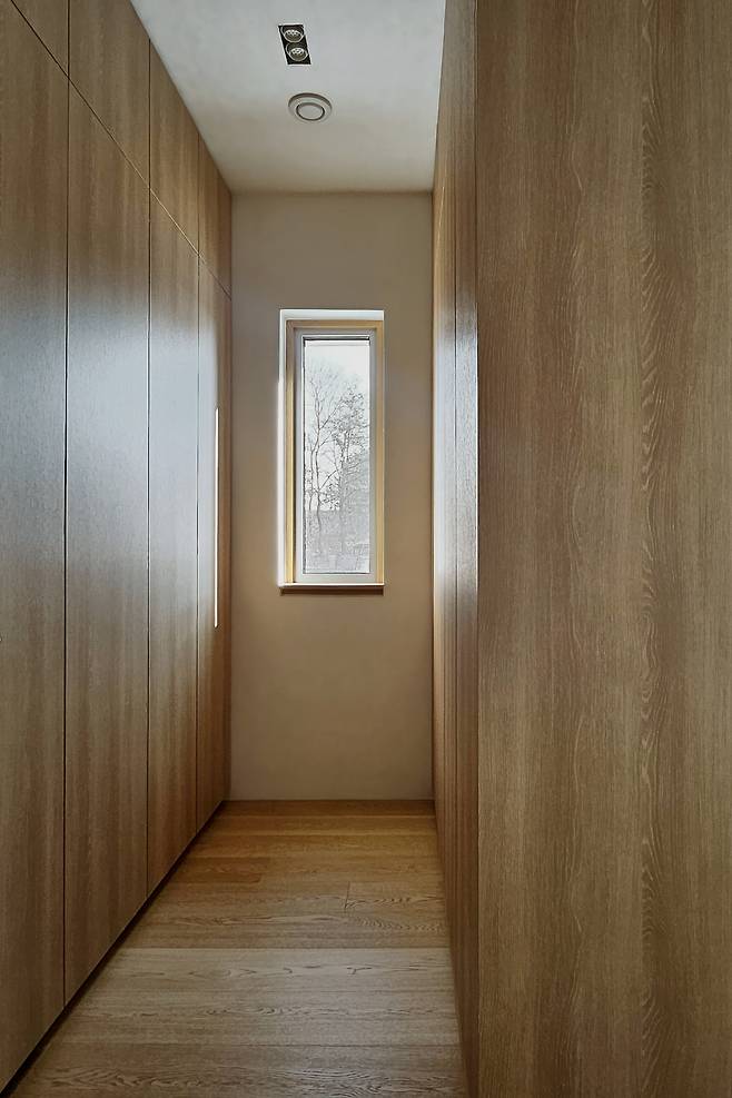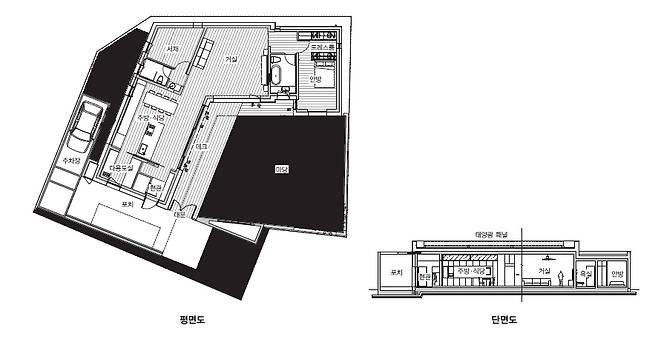 안방은 개방감이 돋보이는 주방·식당, 거실 공간과는 대조적으로 천장고를 낮추고 아늑한 분위기로 조성했다. 안방 드레스룸의 우드 톤 수납장은 공간에 안정감을 더하고 마당으로 연결되는 출입문은 포인트 역할을 한다. 주방·식당과 거실을 분리하듯 꺾인 공간에는 독특한 서재가 마련돼 있다. 안으로 들어가면 마치 작은 미술관에 있는 듯한 착각을 불러일으킨다. 또한 높은 천장고를 활용해 별도의 다락공간을 마련해 여러 짐들을 수납할 수 있도록 계획했다.