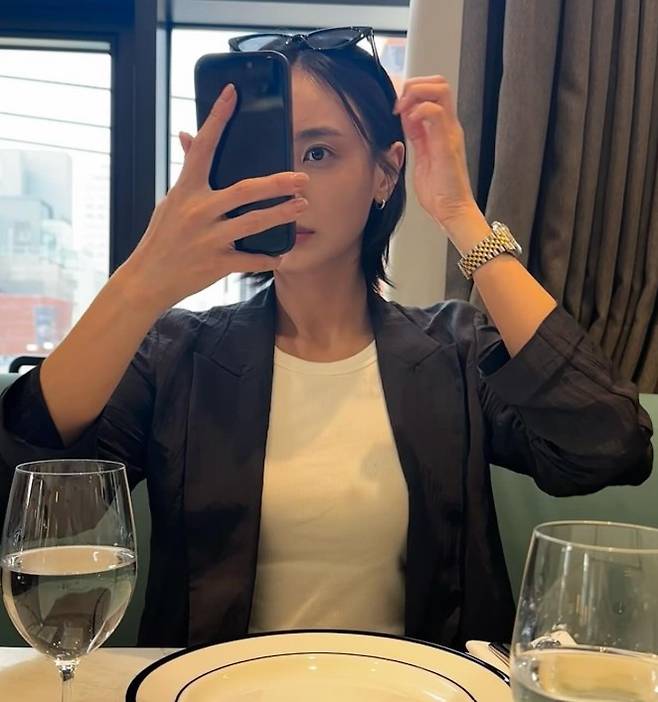 블랙 재킷이 돋보일 수 있도록 이너는 화이트 톤으로 선택.