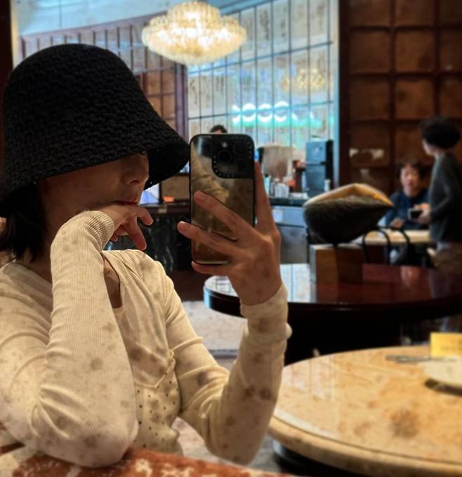 독특한 짜임의 벙거지 모자가 유니크한 무드를 더해주죠.