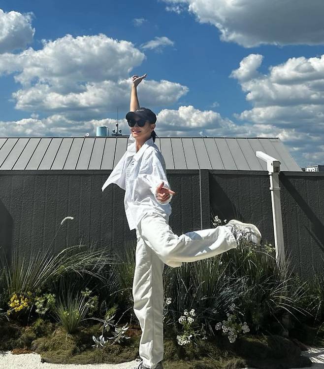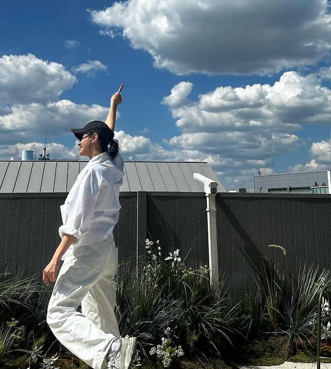 신발은 편안한 운동화지만 옅은 채도의 색감이 룩의 통일감을 살려요.