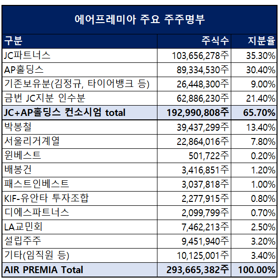최대주주의 지위는 JC파트너스로 유지된다. JC파트너스와 AP홀딩스는 컨소시엄을 구성해 경영 협력 체제를 구축하겠다는 입장이다.