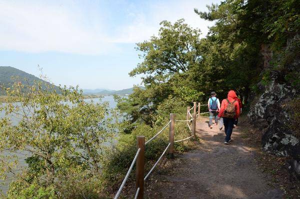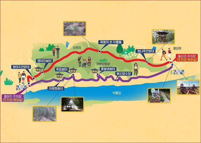 용산리 주차장 출발 -창나루 전망대 -영아지쉼터 -영아지영아지쉼터- 전망대-야생화 쉼터-죽림 쉼터-옹달샘 쉼터-용산 양수장-다시 용산마을로 회귀, 경사가 심하지 않아 걷기 자체는 어렵지 않지만, 절벽 위 좁은 구간이 있어 신발은 꼭 미끄럼 방지 기능이 있는 트레킹화를 추천합니다.