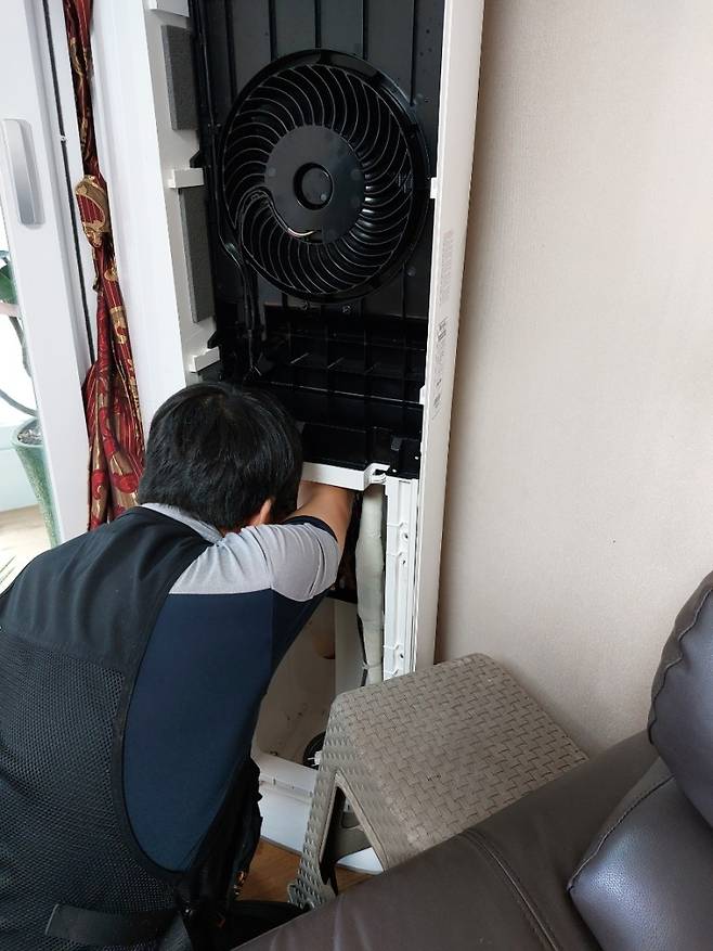 냉각판 청소를 모두 마치면, 앞서 세척했던 부품들을 다시 조립해 주십니다. 저희 집 에어컨의 경우 겉 부분은 분리가 안된다고 하셔서 수건으로 하나하나 닦아주셨어요.