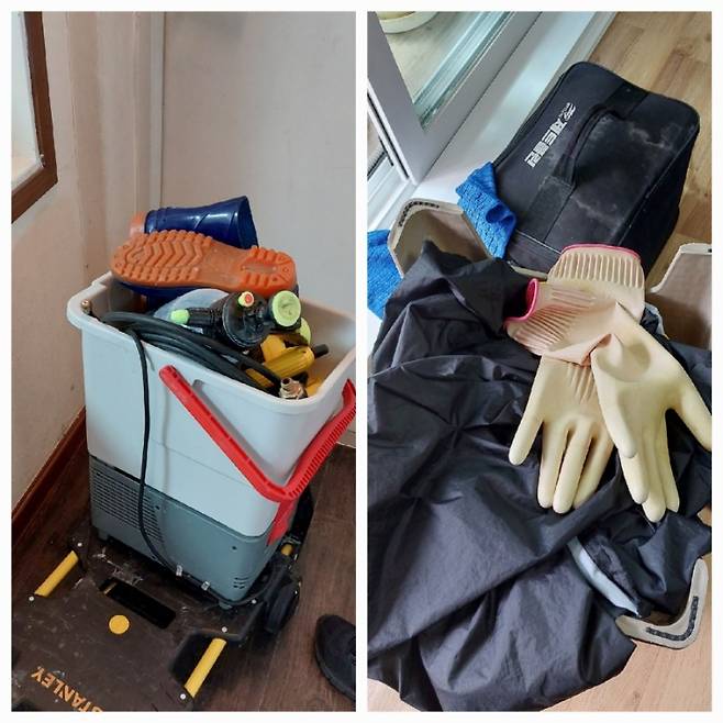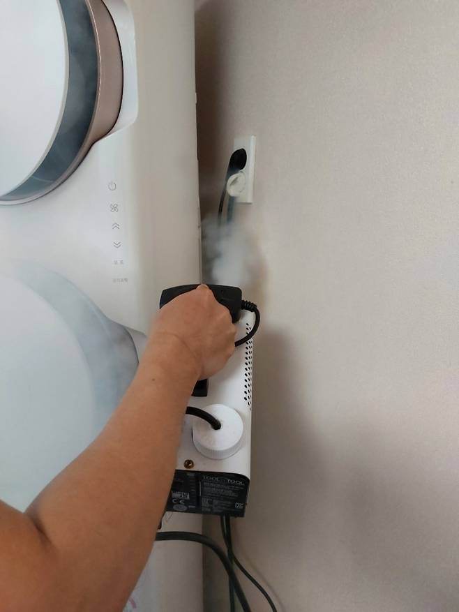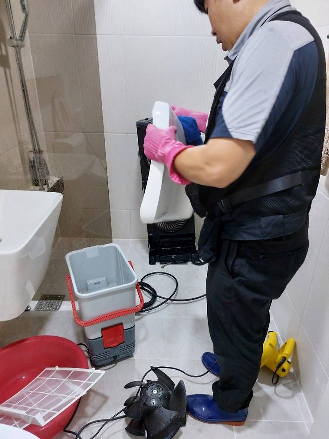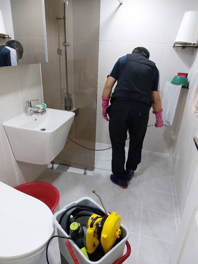 앞서 분리한 부속품은 저희 집 화장실을 활용해 물세척해 주셨어요. 물을 담아 분무할 수 있는 기계도 함께 가지고 오셨더라고요. 물과 세제를 활용해 시원하게 세척해 주셨어요.
