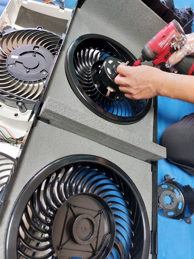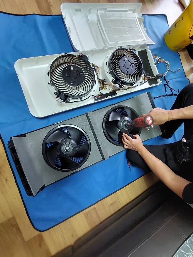 클리닝을 진행하기 전 먼저 제품을 분해해야겠죠? 기사님께서 나사를 하나하나 풀어 부속들을 보호판에 올리셨어요.